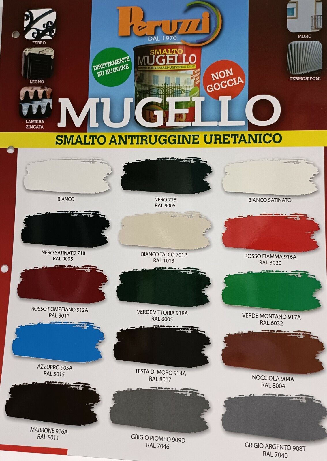 Mugello è uno smalto sintetico inodore universale per ferro, legno, muratura, plastica, leghe leggere, termosifoni.