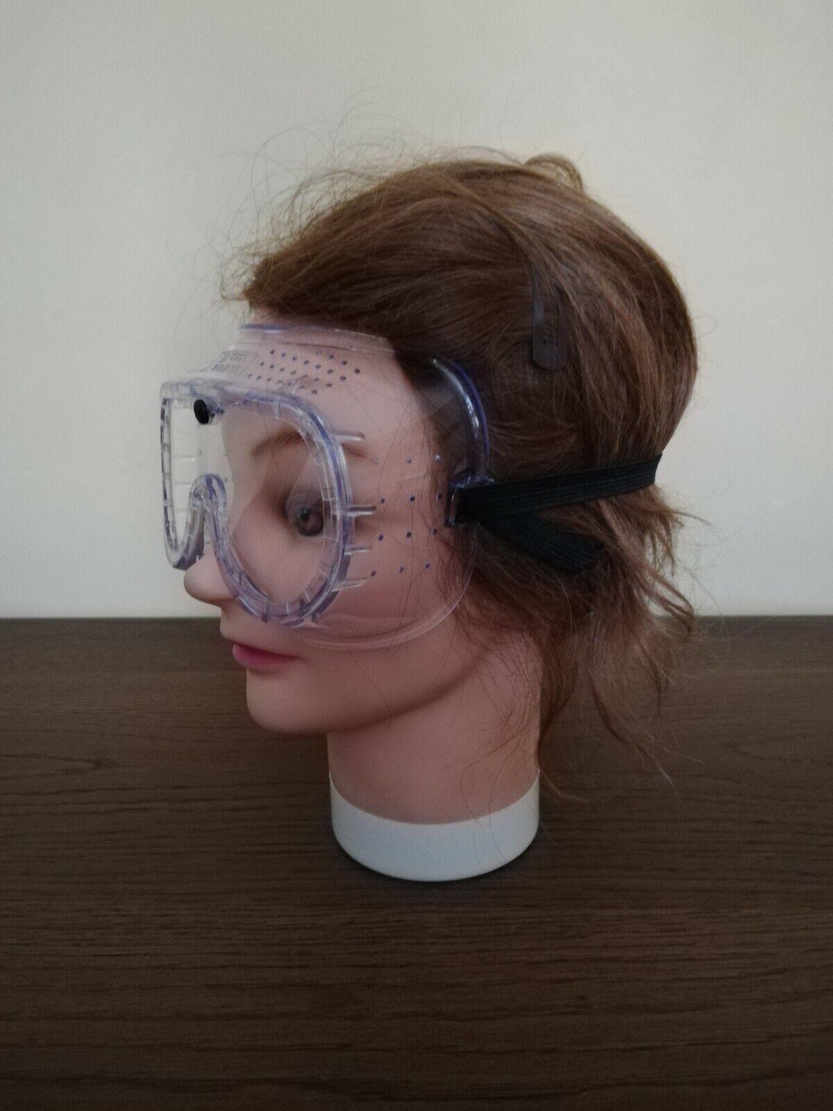 Mascherina in materiale plastico morbido con elastico regolabile. Protezione lenti piane antiappannanti.