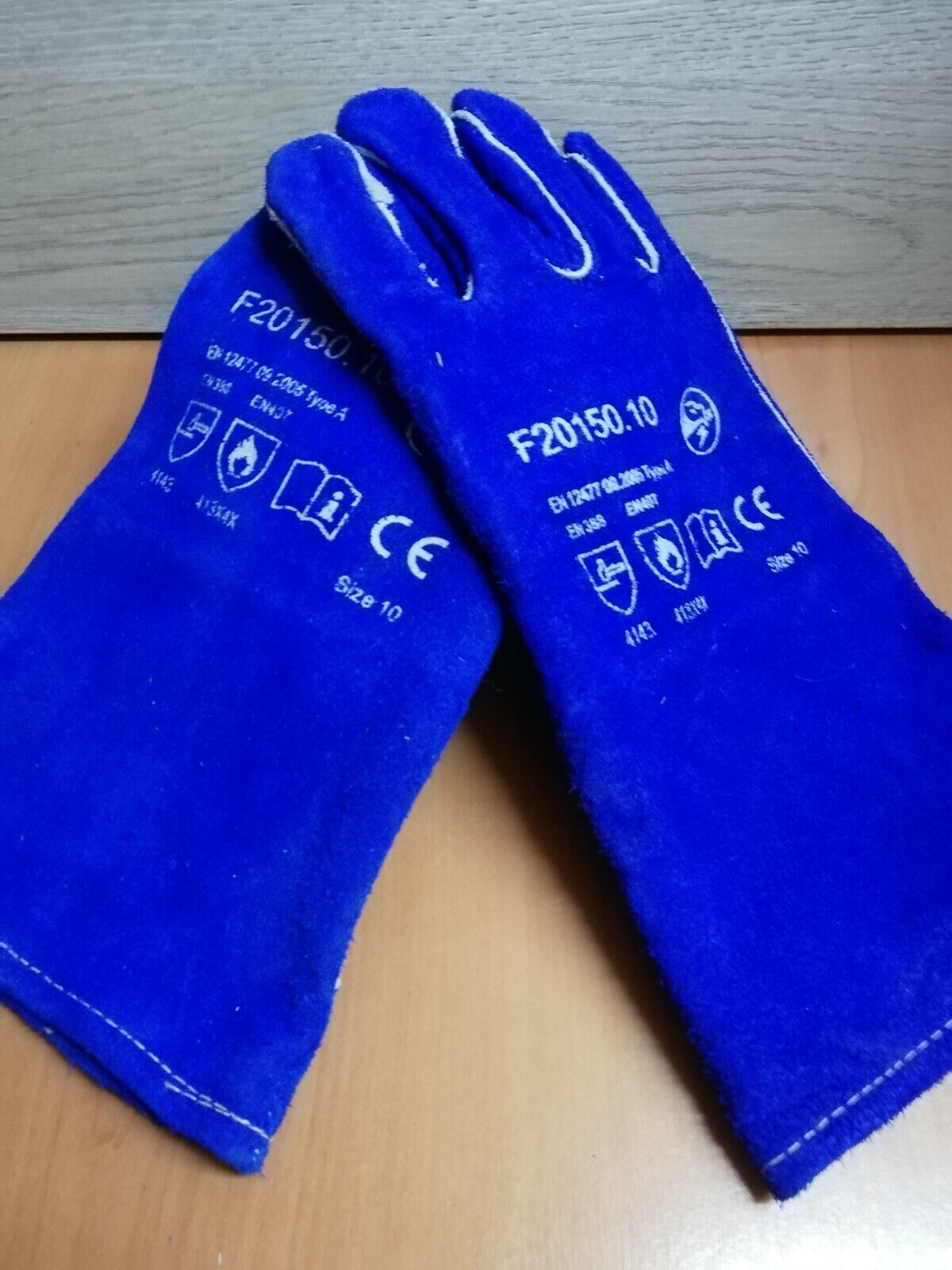 Guanto 5 dita per saldatura in pelle crosta color blu, interamente foderato in cotone, palmo e piega pollice rinforzato in pelle crosta gialla, cuciture in filato Kevlar®.