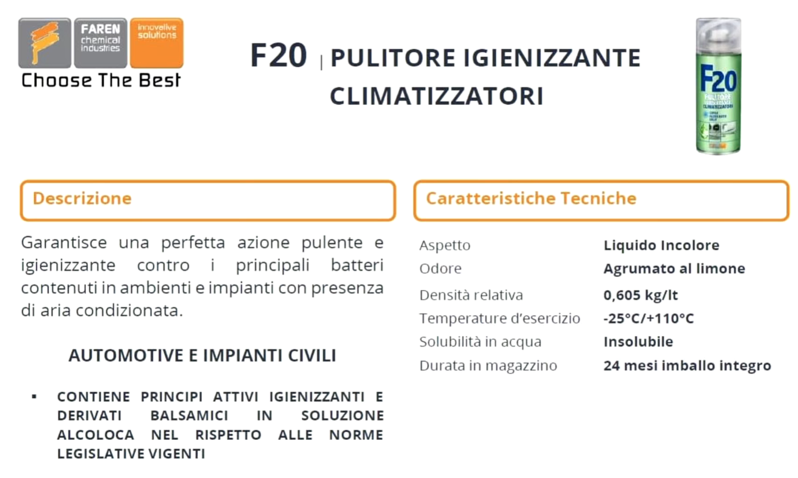 pulitore – igienizzante per climatizzatori civili, automotive, filtri e split – abbina una perfetta azione pulente ed igienizzante contro i principali batteri contenuti in ambienti con presenza di aria condizionata – il trattamento dura dai 10 ai 45 giorni – dotato di una speciale lunga cannuccia a spruzzo tridimensionale per il trattamento dei condotti
